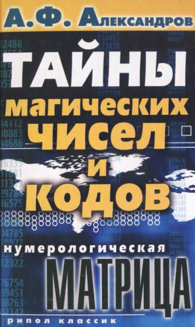 Название: Тайны магических чисел и кодов. Нумерологическая матрица Автор: Александров А. Ф. Год: 2008 г. Страниц: 416 стр. Формат: DJVU Язык: Русский Издание: РИПОЛ классик Размер: 2,77 Mб ISBN: 978-5-386-00657-0 Для сайта: TheBigLibrary.ru Заглянуть в грядущее и узнать, что готовит вам завтрашний день... Понять скрытый смысл загадочных и небъяснимых поступков, которые совершают ваши близкие, а также известные всему миру политики, миллионеры и кинозвёзды... Узнать о сильных и слабых сторонах характера любого человека. Во всем этом поможет метод цифрового анализа, разработанный известным отечественным исследователем и учёным А. Ф. Александровым.